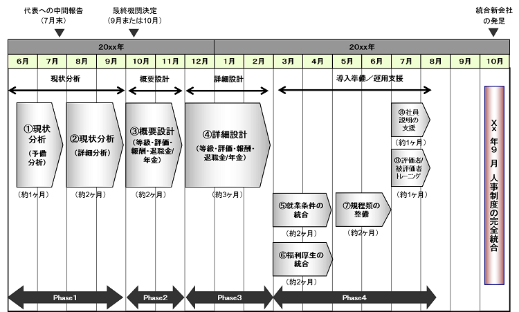 まず、人員体制(人員数と等級別人員数)と総人件費の観点から、人事統合後のあるべき姿を設定します。そして、あるべき姿を実現する上で発生するリスクを想定しながら、段階的に人事処遇を変更していくためのステップを検討します。