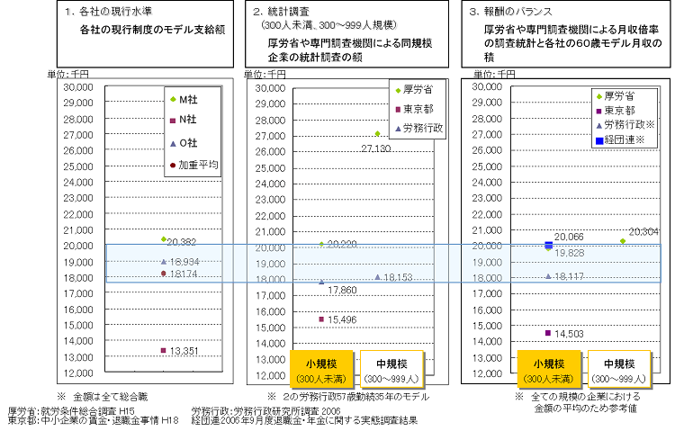 具体的な進め方としては、まず下図にあるような、各社の退職金の水準と、厚労省や専門調査機関の統計、月例給とのバランスなどを参考に、給付水準を探っていきます。