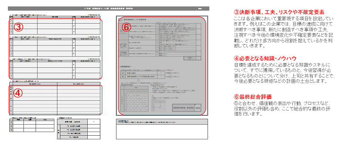そこで、クライアント側ができるだけ簡潔かつ柔軟に運用できるよう、弊社では組織・人事の変革を熟知したコンサルタントが様々な工夫を凝らしています。例えば、役割の再評価基準やその後の処遇を修正する方法の提示、役割の記述・評価と達成度の評価を同一紙面/画面で実行できる帳票の設計なども行っています(後述の「役割設定シートの設計」、「コミュニケーションツール(制度説明、役割設定の手引き、役割評価の手引き)の作成」を参照)。
