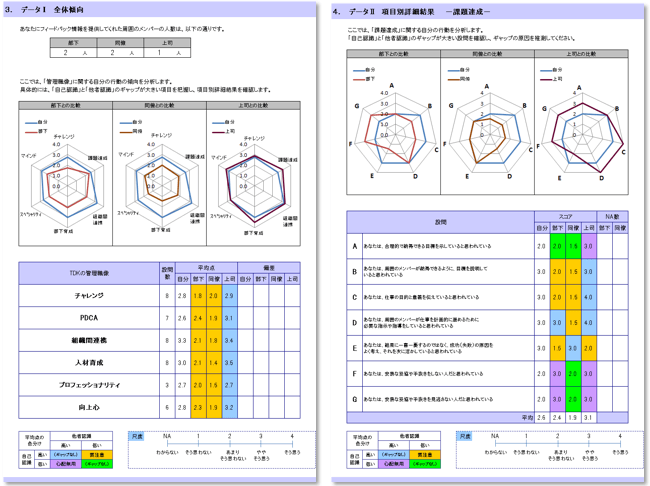 - 多面的な自己分析ができるように、評価データを細かく提示。(評価者別の平均点、点数のバラツキ度合い、評価者の立場毎の評価傾向の違い、など)